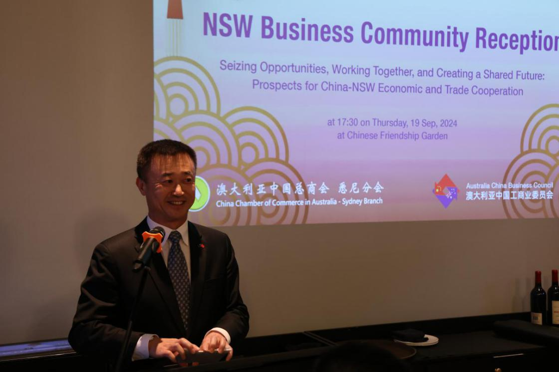 9月19日晚,澳大利亚中国总商会(CCCA)悉尼分会、澳中工商业委员会(ACBC)新州分会在悉尼“谊园”联合举办“中国与新州经贸合作展望”晚宴,王春生代总领事应邀出席并致辞。新州投资局大中华区副总监达明、CCCA悉尼分会会长李芒、ACBC新州分会主席支巧玲及金融、能矿、新能源、农业、航空等领域中澳企业家代表约50人出席。