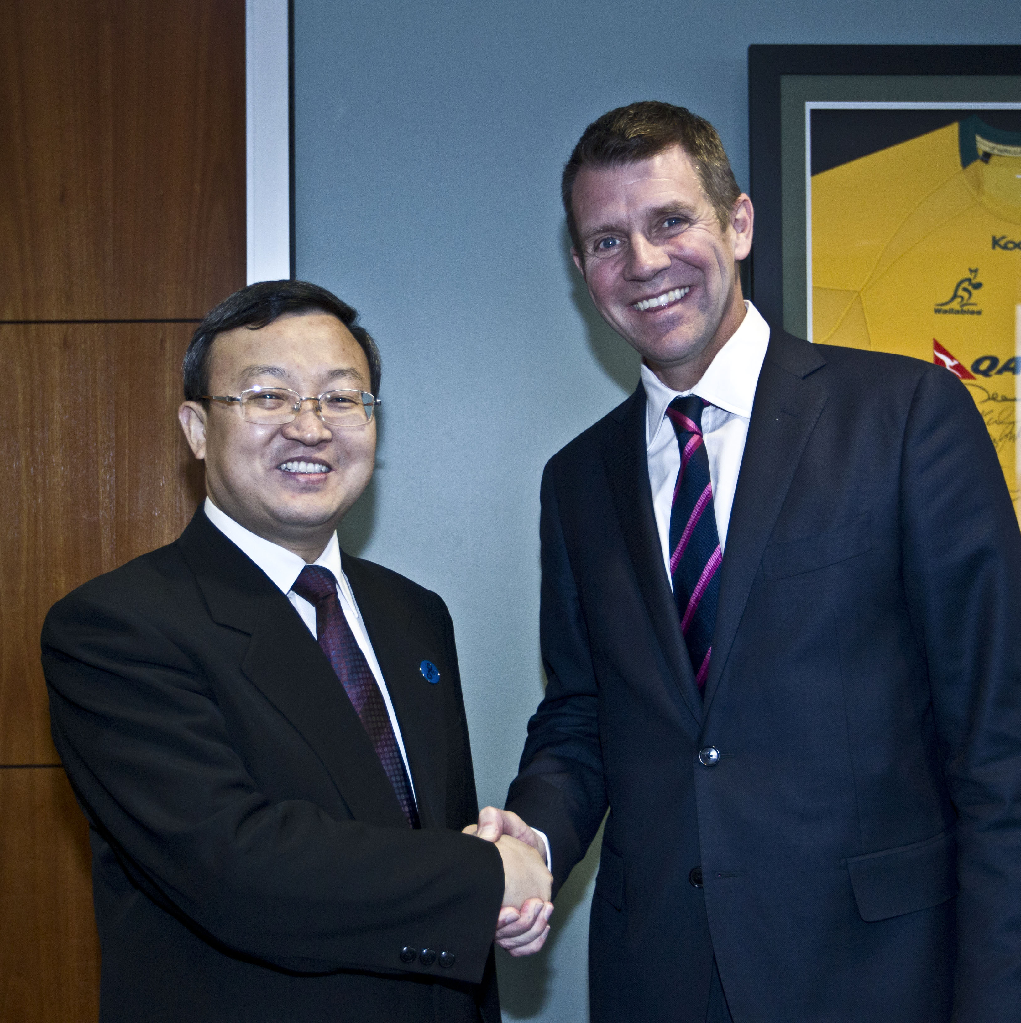 2014年7月18日,在悉尼出席G20贸易部长会议的中国商务部部长助理王受文会见澳大利亚新南威尔士州州长贝尔德。商务部世贸司司长尹宗华、驻澳大利亚使馆经商公参黄任刚、驻悉尼总领馆经商参赞彭刚陪同会见。